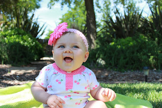 Well it's time for yet another monthly update. These are coming way too fast!! Little Miss Raegan is now 7 months old and is becoming a little mover! She's been through a lot this month and is adjusting well. The move to Sacramento threw her for a loop, but she's slowly coming around. Not only was her environment changed, but she's going through a lot of new changes. She's way more active now, standing up while holding on to things, diving after toys, getting ready to crawl and slowly breaking in some teeth! I'd say that's a lot for a lil' 7 month old to take in just a few short weeks. She's handling it like a pro and entertaining us all daily.