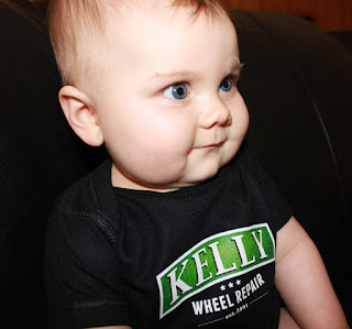So since we're just starting out and couldn't afford a real model, we put our child to work for us! :) Haha. Here's Miss Raegan representing her dad's biz...Kelly Wheel Repair!!
