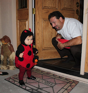On actual Halloween, little Miss Raegan ventured out again in her costume much to her dismay. We joined the neighborhood kids and they just LOVED Raegan. They wanted to carry her around and take her to every house. And again, because she's so young, we only made it to 2-3 houses, but her new friends made sure they collected candy for her basket! It was so cute and probably more fun for us, but again, made for great pictures!!